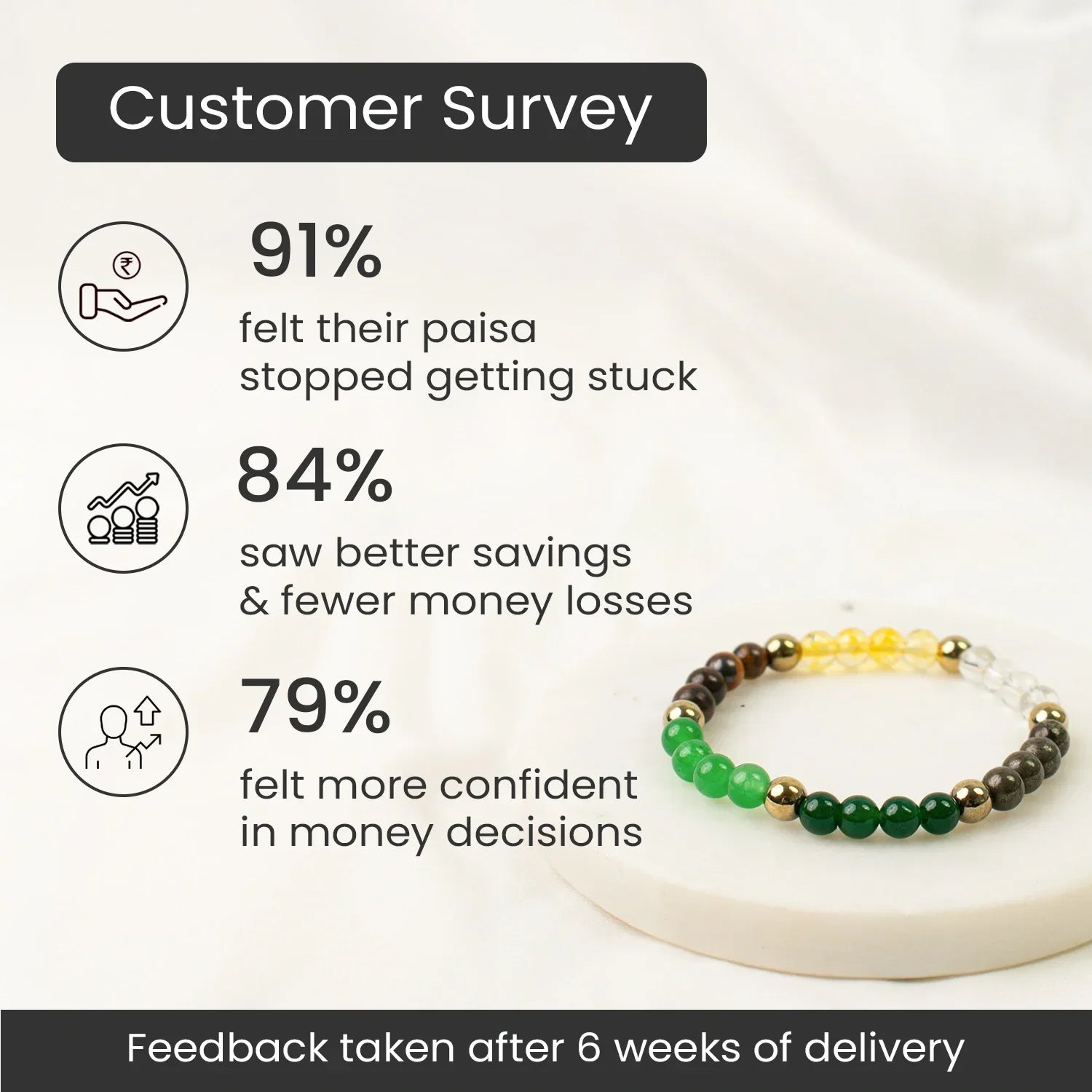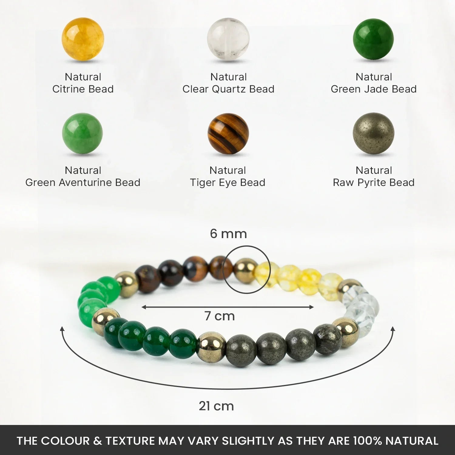 Every woman deserves success with style, and the Dhan Yog Bracelet for women is made for that. With smaller 6mm beads, it looks elegant and suits the delicate charm of ladies and girls. Made with powerful crystals: Tiger Eye, Pyrite, Citrine, Quartz, Green Aventurine, and Hematite, it helps attract wealth, career growth, and good luck.