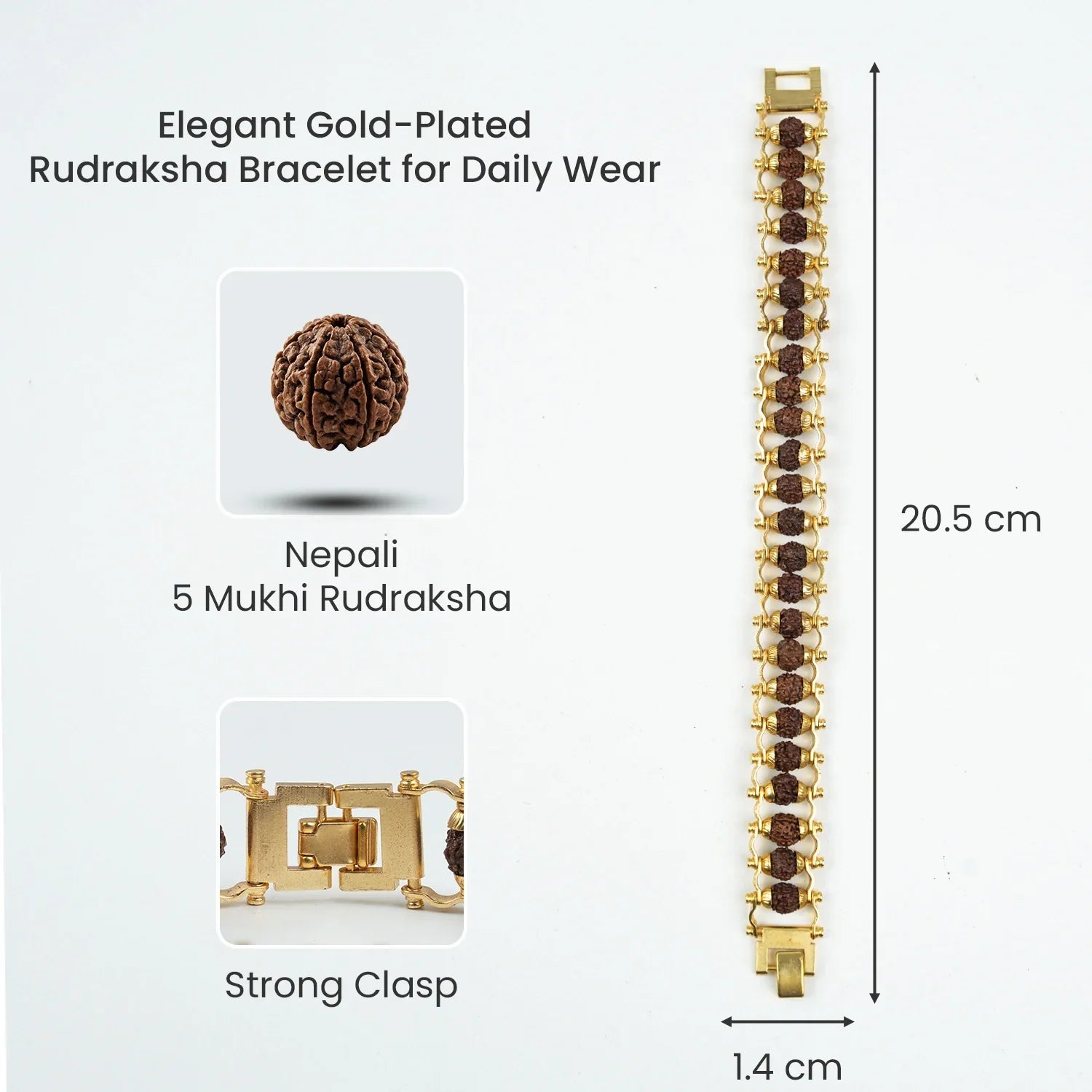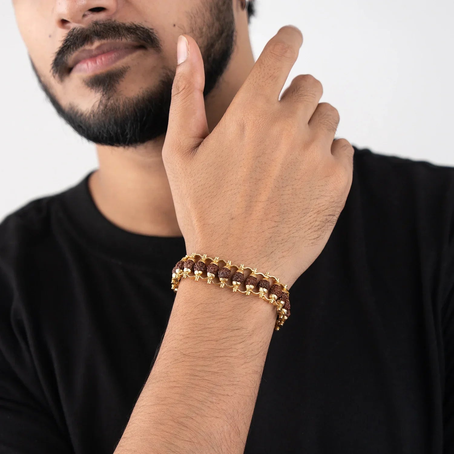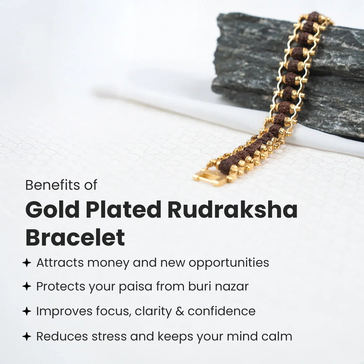 The Gold Plated Rudraksha Bracelet is made with Nepali origin 5 mukhi Rudraksha beads that are known for bringing protection, knowledge and positive growth. The gold-plated elements add a stylish and elegant finish, making it suitable for everyday wear.