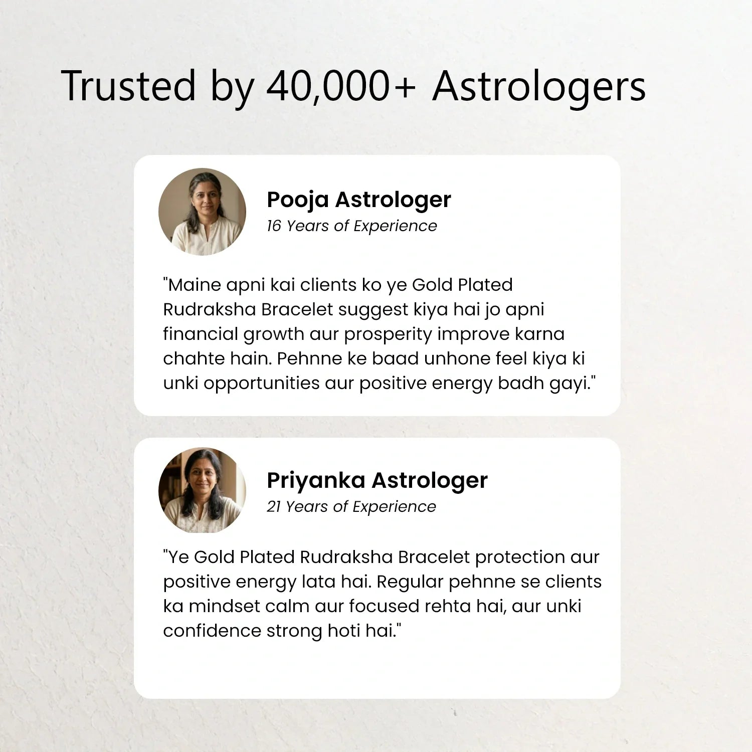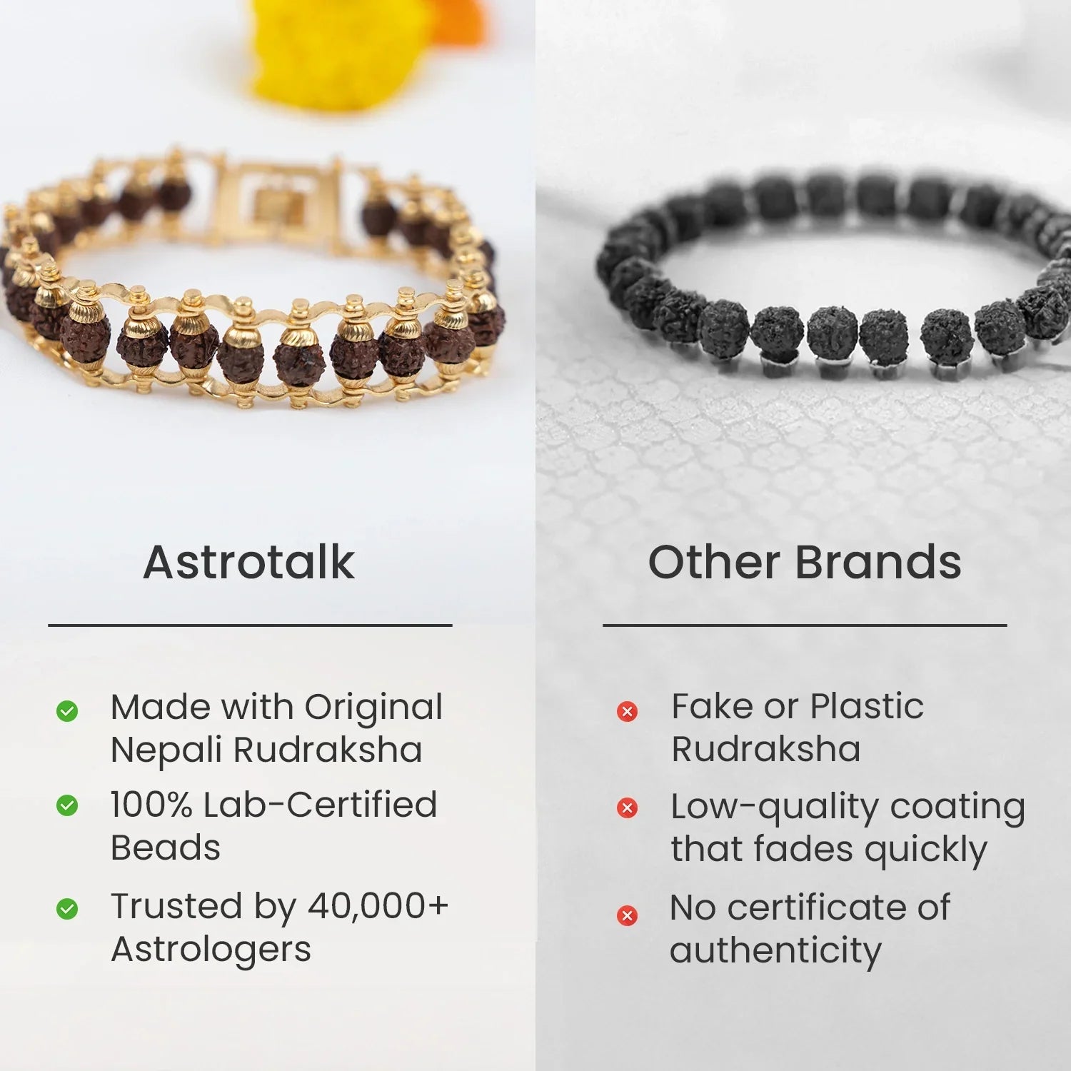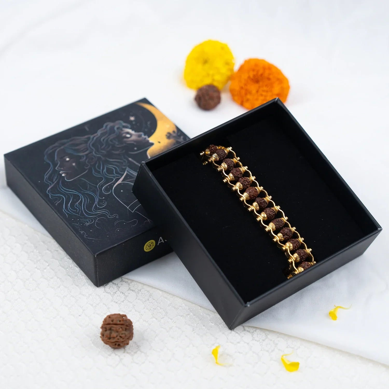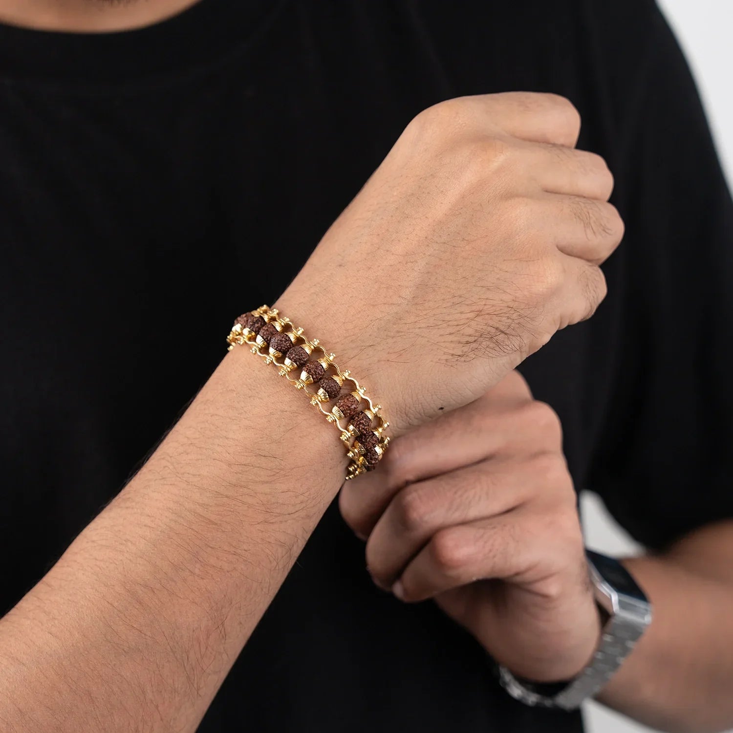 The Gold Plated Rudraksha Bracelet is made with Nepali origin 5 mukhi Rudraksha beads that are known for bringing protection, knowledge and positive growth. The gold-plated elements add a stylish and elegant finish, making it suitable for everyday wear.