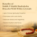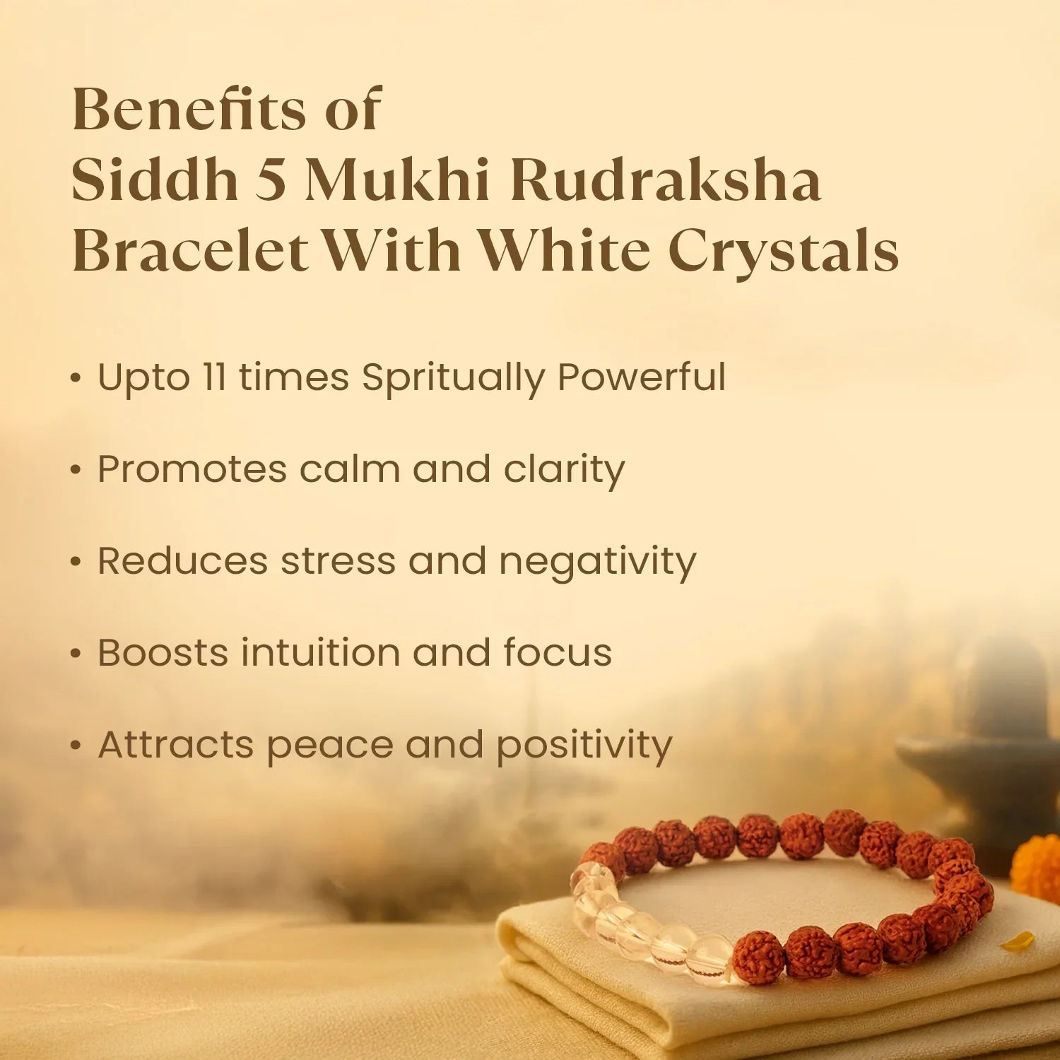 Experience powerful and divine blessings with this Limited Edition Siddh 5 Mukhi Rudraksha Bracelet With White Crystals. Representing Lord Shiva, it's powerfully Siddh with Rudraabhishek at Kashi's 1000 years old Kedareshwar Mahadev Mandir. These Rudrakshas are more powerful and effective.