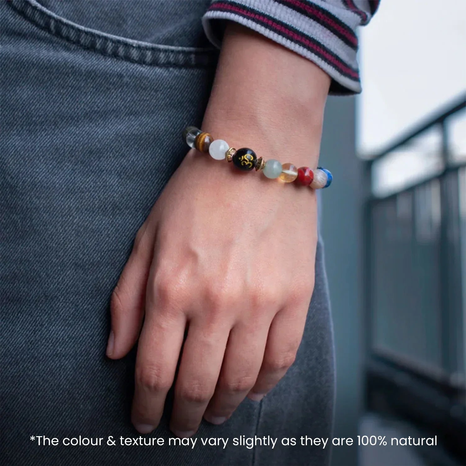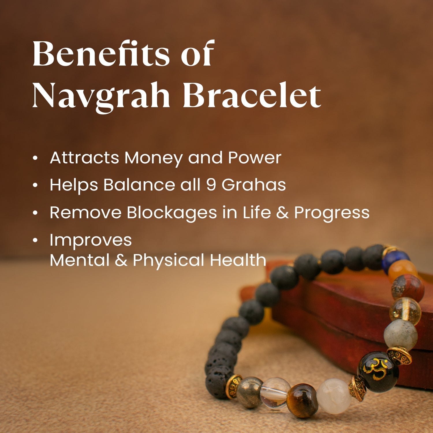 Bring harmony and prosperity into your life with the Navgrah Shanti Bracelet with Raw Selenite Plate. This bracelet is designed to balance all nine planets with the power of nine gemstones – Sunstone, Moonstone, Red Jasper, Green Aventurine, Citrine, Clear Quartz, Pyrite, Lapis Lazuli, and Tiger Eye – along with lava beads and an Om bead for peace and grounding. It helps attract money, reduce planetary doshas, and bring mental clarity. Starting to wear this bracelet during Dhanteras/Diwali is considered highly auspicious, as it enhances its energy and blessings.