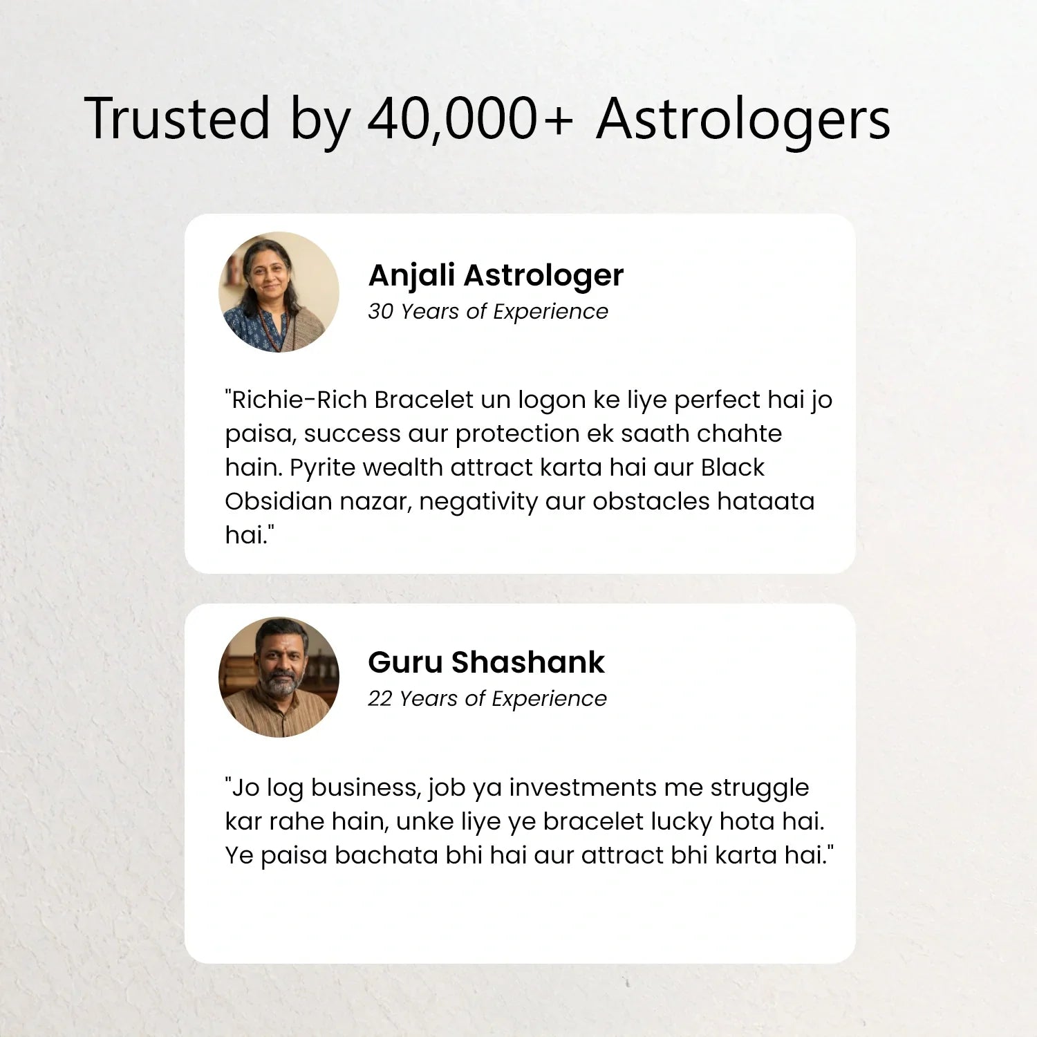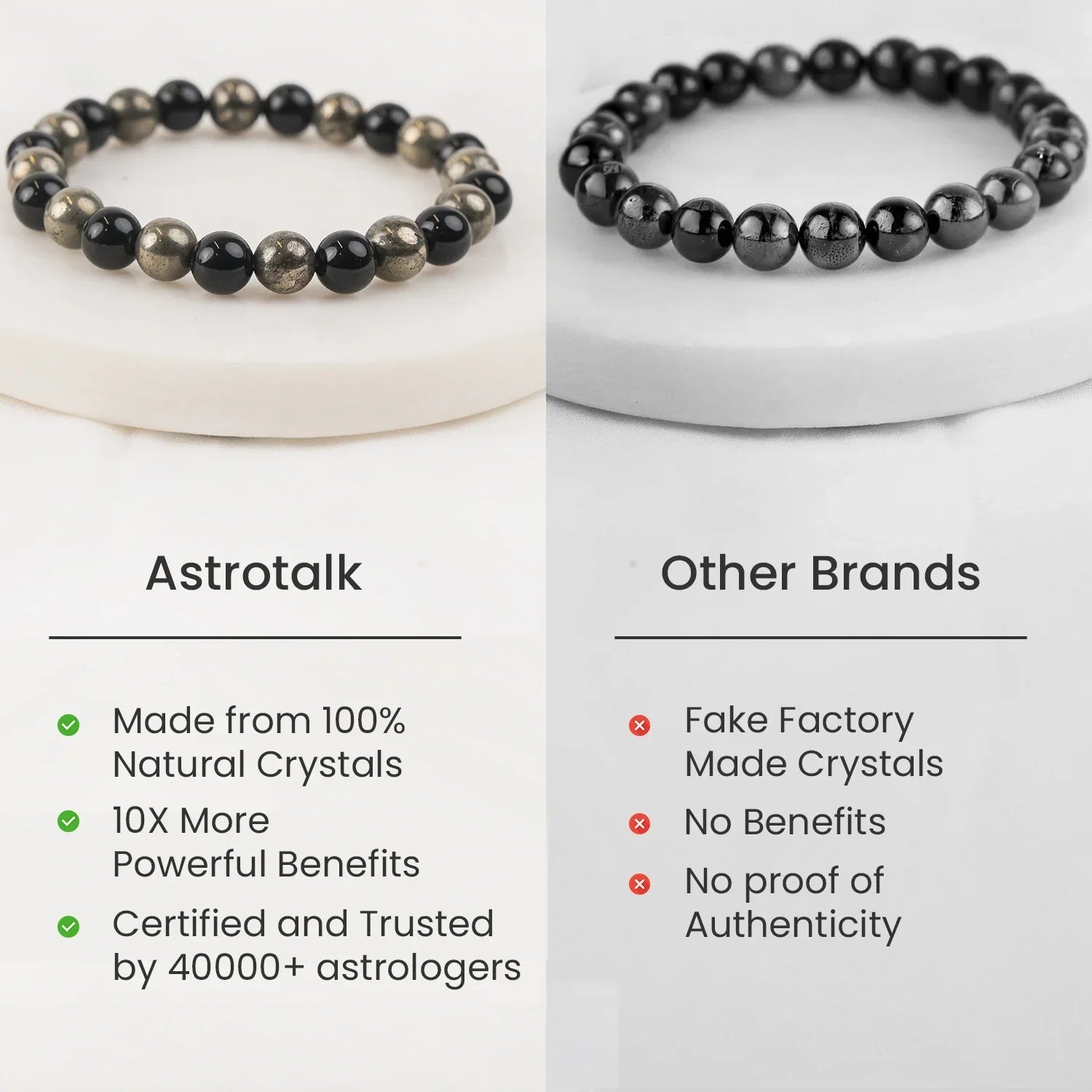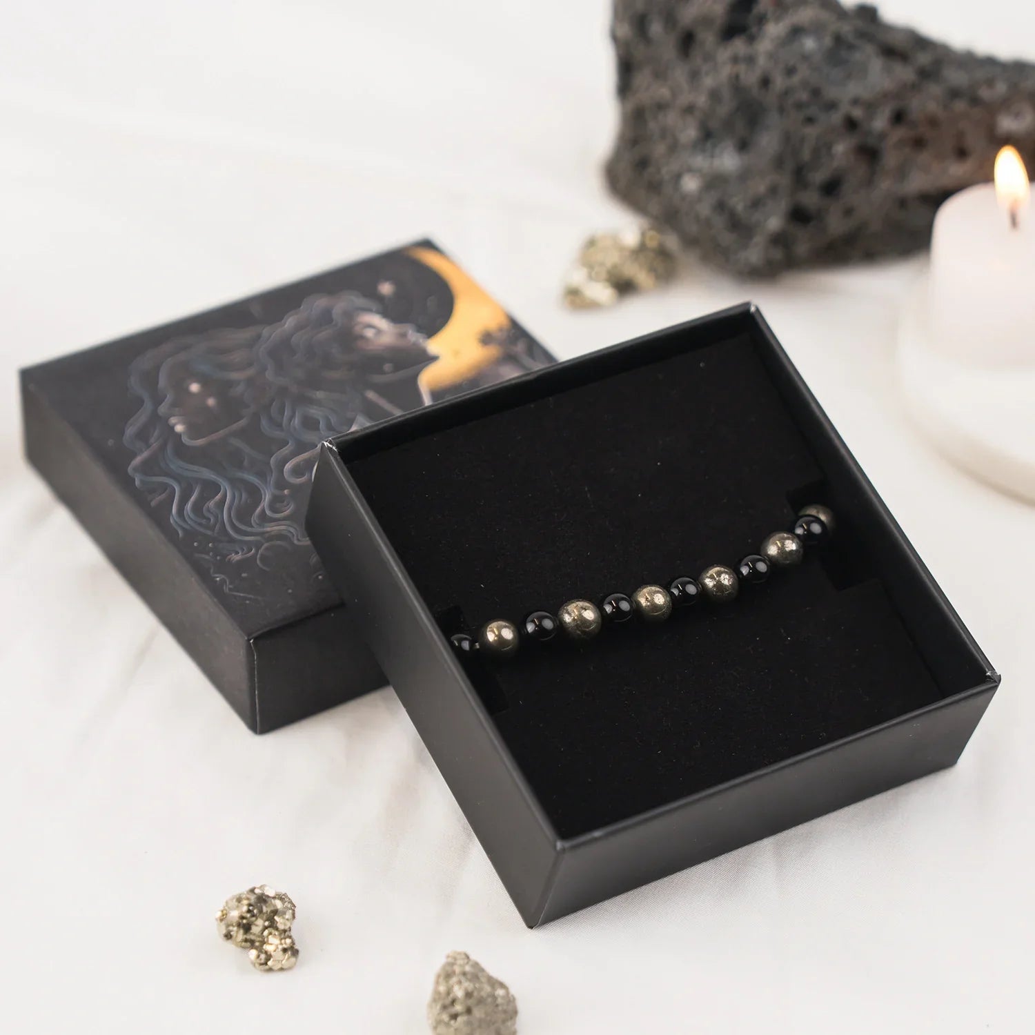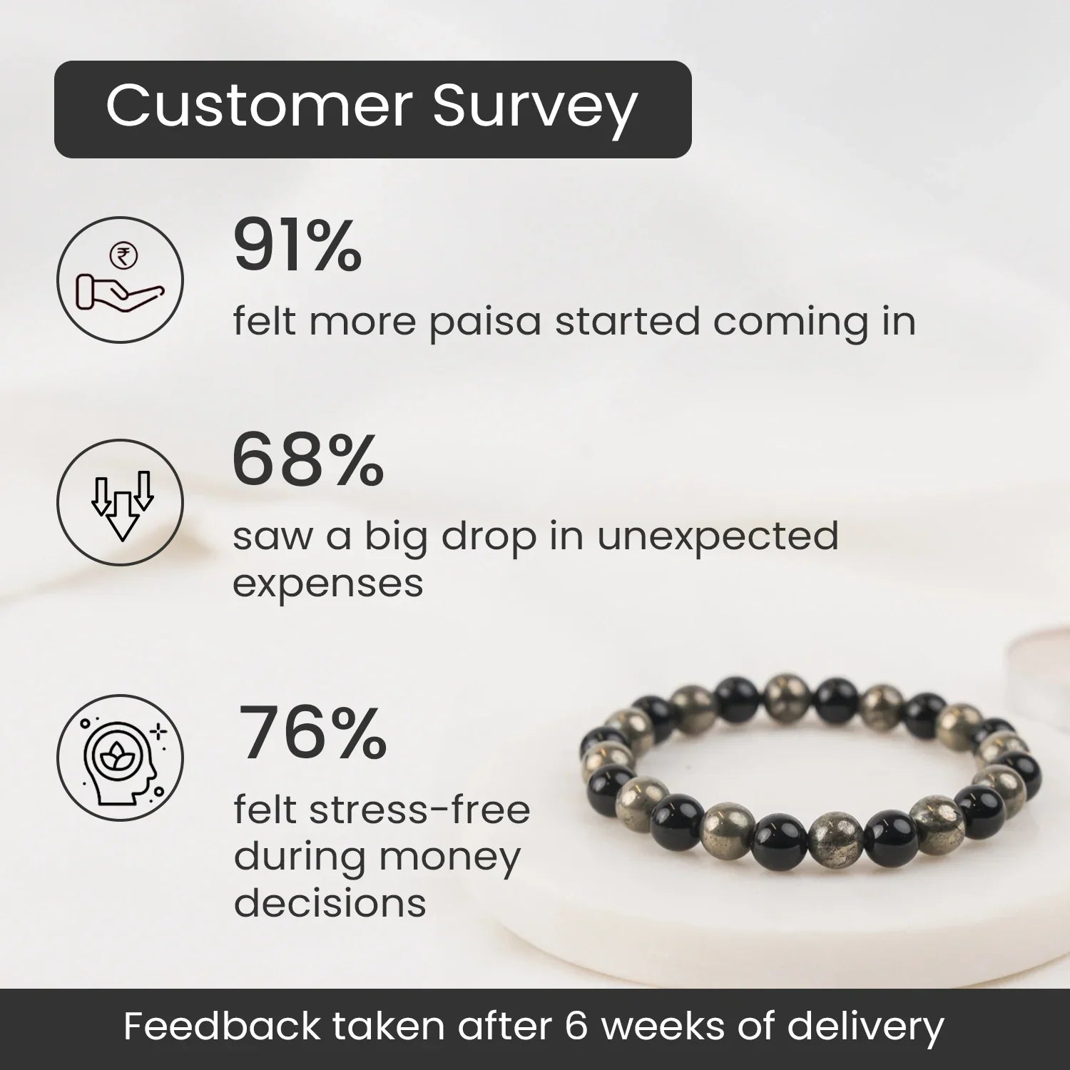 The Richie-Rich bracelet is a powerful combination of Pyrite and Black Obsidian. Pyrite is known as the “Money Magnet,” and Black Obsidian is the “Stone of Protection.” Together, this combo ensures that your paisa stays safe from buri nazar.