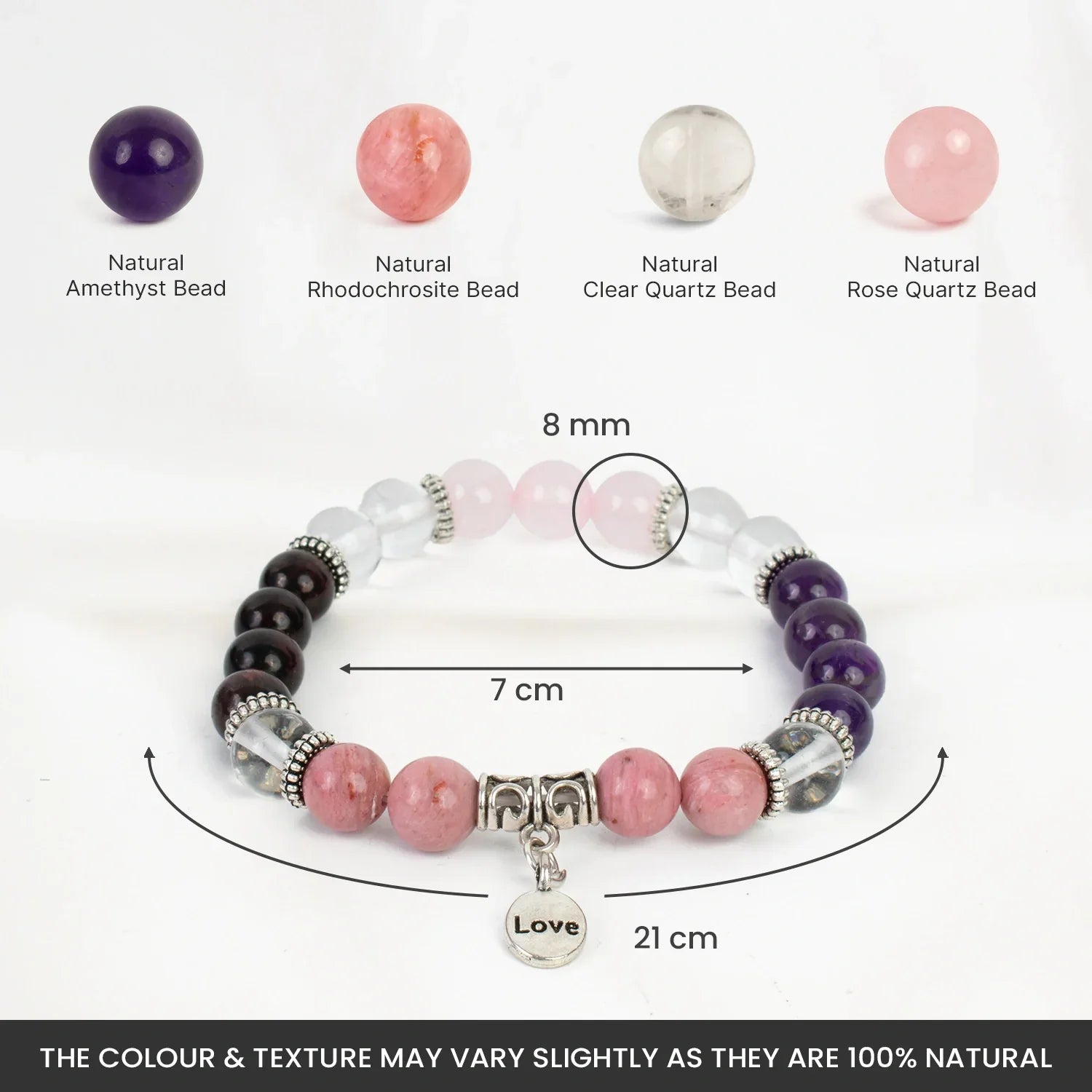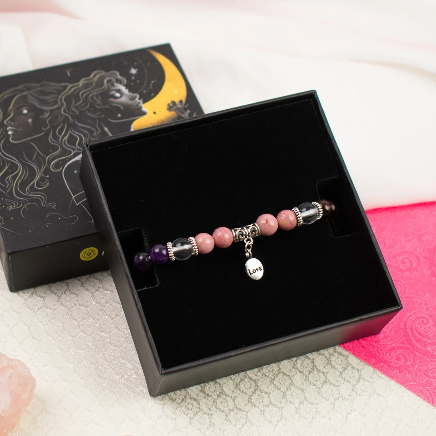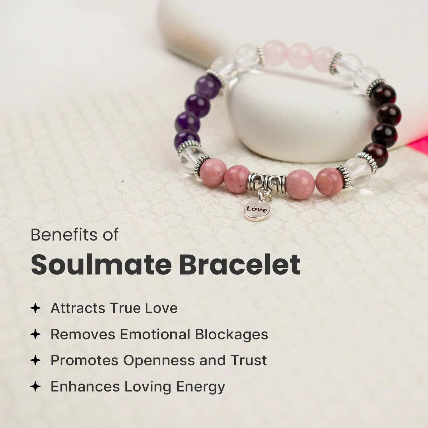 The Soulmate Bracelet helps strengthen emotional bonds and attract love into your life. Made with rose quartz, amethyst, clear quartz, and black tourmaline, these crystals bring love, healing, and protection. It promotes compassion, trust, and understanding in relationships. Its adjustable design fits any wrist, perfect for daily wear.
